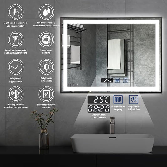 Bathroom Mirror with LED Light 600 x 800 MM Backlit Illuminated Wall Mounted Vanity Mirror with Demister Anti-Fog Makeup Mirror Dimmable 3 Color LED Light Touch Control Time Display IP44